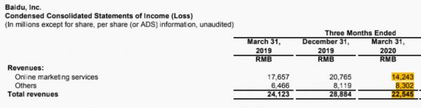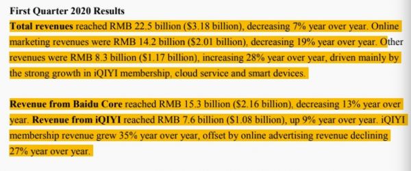 百度董事长兼CEO李彦宏表示:“第一季度,受疫情影响人们均居家隔离,百度营收在此期间仅同比下降7%。这主要得益于多元化的收入来源,包括面向各行各业的营销服务、AI新业务和爱奇艺。。”