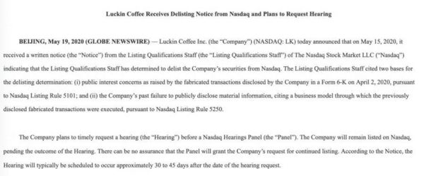 5月19日晚,瑞幸咖啡公告称,于5月15日收到了纳斯达克上市资格审查部门的书面通知,决定对瑞幸施行摘牌。对此,瑞幸计划举行听证会,在听证会结果出炉前,瑞幸将继续在纳斯达克上市。