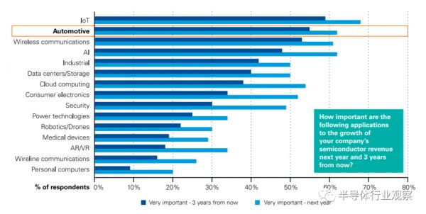 在2019年第14次毕马威全球半导体高管调查中,半导体高管表示,汽车是未来几年公司增长的第二重要应用,仅次于物联网(loT),领先于无线通信应用。显然,汽车市场已经成为半导体行业领导者的首选。