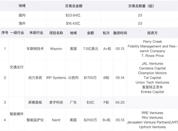 鹰眼投研数据研究表明,本周全球大额交易共计40.07亿美元,交易金额环比下降35.62%,大额交易规模流入金额波动性较大。该周期内大额交易聚焦于交通出行和智能硬件等领域,谷歌母公司Alphabet旗下自动驾驶汽车和卡车子公司Waymo宣布其已经额外筹集7.5亿美元资金,此前Waymo宣布获得包括银湖资本、Alphabet和麦格纳国际公司等在内的22.5亿美元融资,至此,Waymo于73天将其首轮外部融资总额增至30亿美元。本轮新获得的资金将被Waymo用于投资于其劳动力、第五代传感器系统研发和运营Waymo One叫车服务,以及打造Waymo货物运输服务。