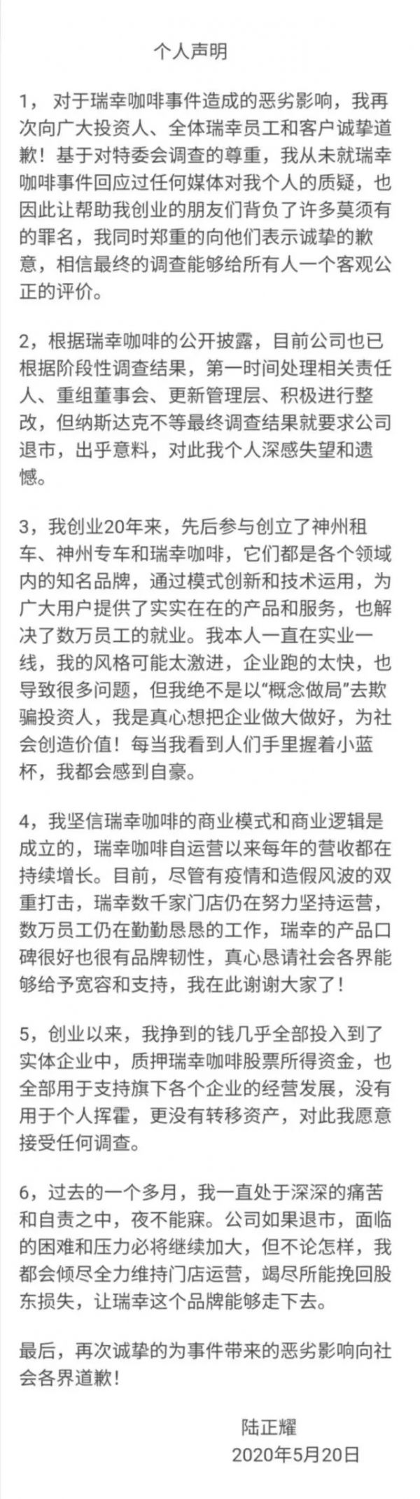 陆正耀在声明中说到:自己一直在实业一线,风格可能太激进,企业跑的太快,也导致很多问题,但我绝不是以"概念做局"去欺骗投资人,是真心想把企业做大做好,为社会创造价值!每当我看到人们手里握着小蓝杯,我都会感到自豪。“我坚信瑞幸咖啡的商业模式和商业逻辑是成立的,瑞幸咖啡自运营以来每年的营收都在持续增长。”