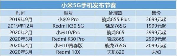 2019年底,小米董事长雷军就表示,2020年上半年小米2000元以上的中高端手机将全部是5G手机。而2020年小米将至少发布10款5G手机。